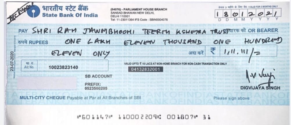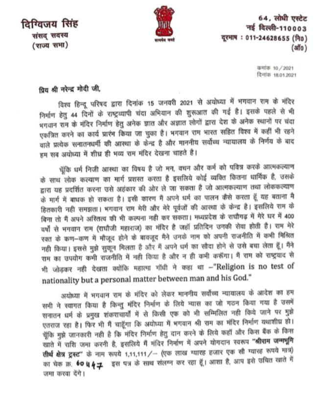On Monday, Digvijaya donated an amount of ₹1,11,111 to the Shri Ram Janmabhoomi Teerth Kshetra but claimed to not know where to make the donation. In a letter addressed to Prime Minister Narendra Modi, he wrote, “As I am not aware of where to donate money and in which bank account, therefore, I am enclosing a cheque of Rs 1,11,111 for Shri Ram Janmabhoomi Teerth Kshetra with a hope that you (PM Modi) will get it deposited in an appropriate account,” Singh wrote in a letter to PM Modi.