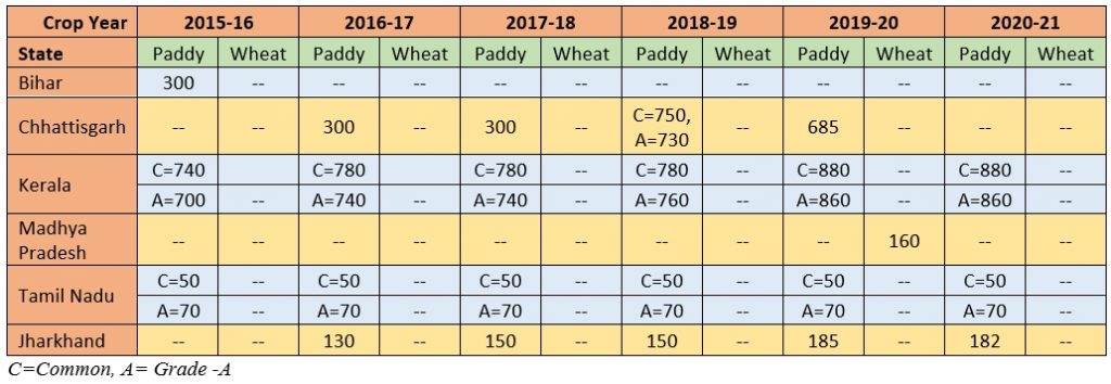 State Govts often declare state bonuses for procurement of crops, which is a monetary scheme to incentivise their farmers over and above MSP declared by the Government of India. In some states, the bonuses are crop-specific whereas in another these are of generic form.
