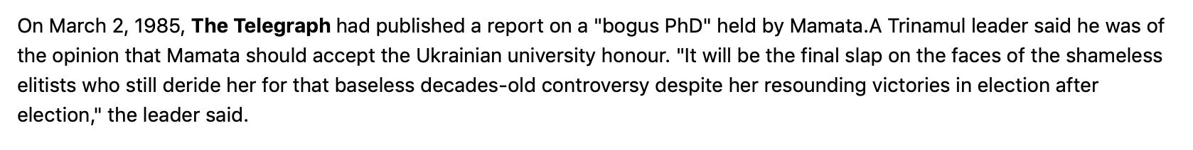 A Twitter user named @trunills has shared an old newspaper clip from ‘The Telegraph’ saying that Mamata Banerjee, an MA in Islamic History from Calcutta University, had in 1982 claimed that she had received the “doctorate” for her research work entitled “The Impact of Mughal Harem on state and policies” under the guidance of a certain Dr. Karuna Pada Datta.