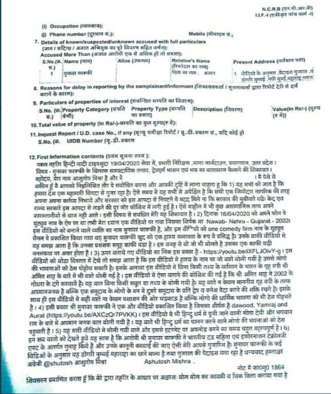 The police had booked the accused under Indian Penal Code (IPC) Sections 153A (Promoting enmity between different groups on ground of religion), 295A (Deliberate and malicious acts, intended to outrage religious feelings of any class by insulting its religion) and Section 65 and 66 IT Act, 2008. The case is based on the YouTube video, uploaded by Faruqui, wherein he was seen making derogatory remarks against Hindu deities, mocking the deaths of Hindus in the Godhra train burning case and insinuating the role of the RSS and Home Minister in the carnage.