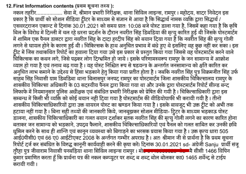 On Saturday, a complaint was registered against Varadarajan under Section 153B and 505 of the IPC in Rampur police station for trying to instigate the crowd by peddling false information about the death of a rioter named Navreet Singh, who had died during the tractor rally after his tractor turtled.