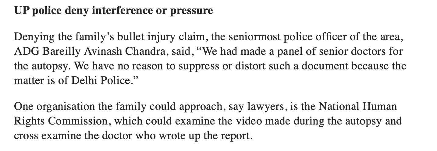 But the claim of doctors being railroaded to prepare a false autopsy report was refuted by the senior-most police officer quoted by The Wire. According to ADG Bareilly Avinash Chandra, the police had no reason whatsoever to suppress or distort such a document because the matter is of Delhi Police.