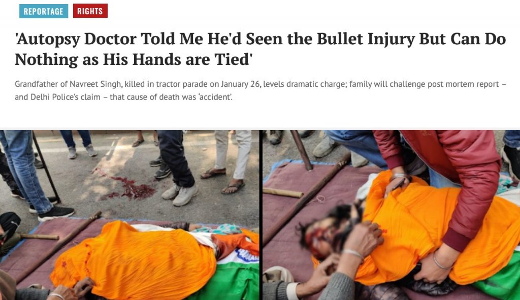 However, the report published by Siddharth Varadarajan’s website quoted Hardeep Singh Dibdiba, the grandfather of the deceased, who said that a doctor had confided in him that the real cause of Singh’s death was a bullet injury.