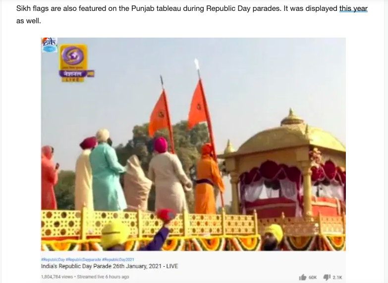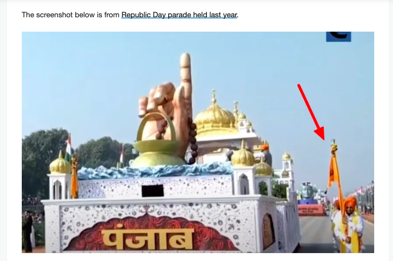 To prove a point, AltNews shared image of the 2020 Republic Day parade with Punjab tableau. As one can again see, the Nishan Sahib here was also saffron triangular flag, not yellow rectangle flag.