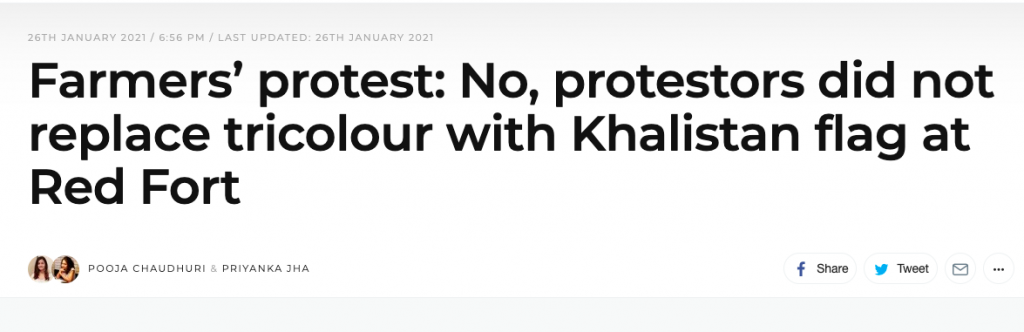 The Quint, too, ‘fact-checks’ the empty pole where the Nishan Sahib and the other farmer union flag was hoisted. However, it does not talk about the second flag which is on the higher level at the Red Fort where the tricolour flies every day.