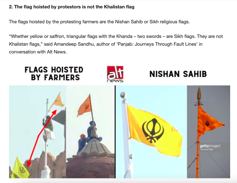 While it is indeed true that farmer unions also brought their own flags and hoisted them, the particular yellow rectangle flag with holy Sikh symbol in blue is not even mentioned in this ‘fact-check’.