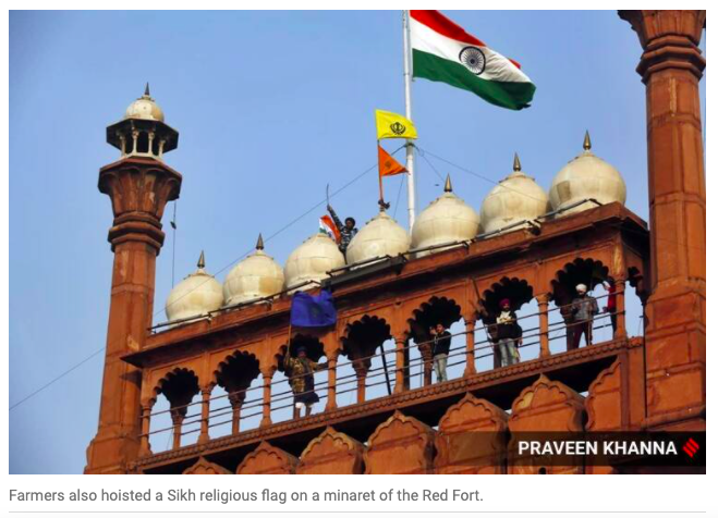 As per NDTV’s @ghazalimohammad, the flag hoisted by protestors at the Red Fort is sacred to Sikhs, seen outside gurudwaras where it is called the Nishan Saheb. It did not (mercifully) replace the tricolour, which remains aloft at the Red Fort at an elevation.