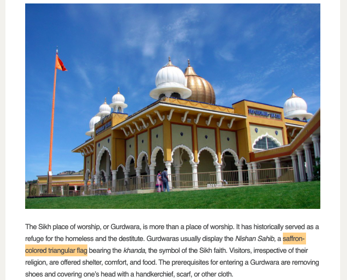 Another website on Sikhism, Sikhnet, too describes the Nishan Sahib as saffron-coloured triangular flag.