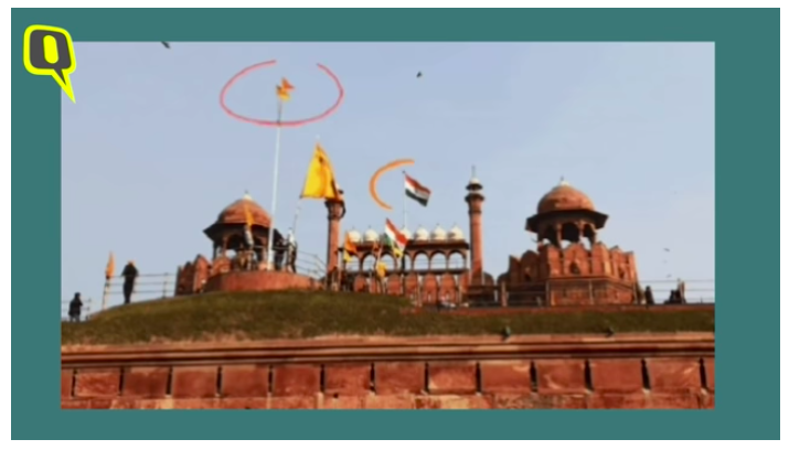 In the video shared by Twitter user Rosy, she talks about the two flag hoisted where the tricolour (near the saffron semi-circle) was hoisted. The Quint has fact-checked, the empty pole where saffron triangular flag (Nishan Sahib) and yellow farmer union flags are hoisted.