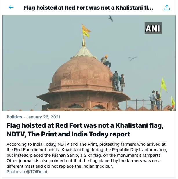 The India Today report Twitter has used for flagging the above video as manipulated does not mention the shape of the Nishan Sahib. In fact, the report only states matter of factly that the Nishan Sahib was hoisted. It does not specify the colour of the shape of the flag. The report is from 26th January 2021 and it states the ‘farmers’ hoisted the Nishan Sahib on the Red Fort.