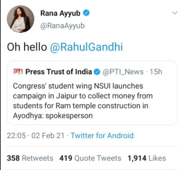 Rajasthan NSUI’s decision to collect funds for the construction of the Ram temple has made the liberals uneasy. Apparently, the news particularly disturbed ‘journalist’ Rana Ayyub who tagged Congress scion Rahul Gandhi on Twitter seeking his response on the NSUI’s drive.