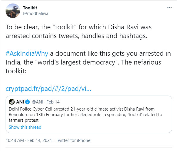 Disha Ravi was arrested on February 13 by the Cyber Cell division of Delhi Police from her home in Bengaluru. According to the police, she was the key conspirator in creating and distributing the Greta ‘Toolkit’. The police informed that the objective was to spread ‘disaffection against the Indian State.’ Reportedly, it was Disha who had originally shared the Toolkit document with the Swedish ‘aandolanjivi’ Greta Thunberg.