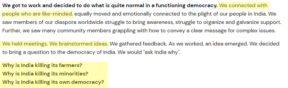 In a statement after Greta Toolkit exposed the nexus, Mo Dhaliwal’s Poetic Justice Foundation had issued a statement in which Dhaliwal admitted that he had meetings with ‘like-minded’ people and brainstormed ‘ideas’ to come up with the plan to use farmer protests for his own benefit. In the statement, he made outrageous claims such as the sexual assault on activist Nodeep Kaur in police custody and used discontinuation of Amentsy India’s chapter for his agenda. This claim was summarily debunked by Nodeep Kaur and her police statement itself.
