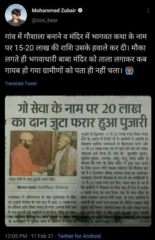 Mohammed Zubair, who has quietly deleted the Tweet after being called out, had shared a Hindi article in his Tweet, which he posted in the afternoon today. In his attempt to demonise Hindus, Zubair highlighted that a ‘Baghwadhari’ (saffron-robed) baba absconded with Rs 15-20 lakh temple offerings. While sharing the screenshot of the Hindi report, Zubair carefully edited out the date of the report, so that he could pass it off as a current report.