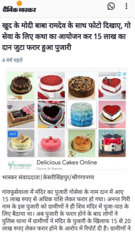 The 4-year-old news item was about a fake Sadhu who had apparently collected donations from villagers and absconded with temple funds.