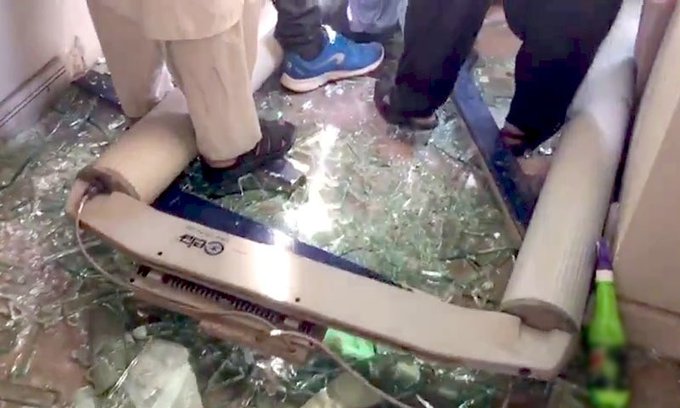 The news channel released photographs from their office showing broken glass panels lying in the reception area of the office. They also claimed that police remained a mute spectator while their office was being vandalised.