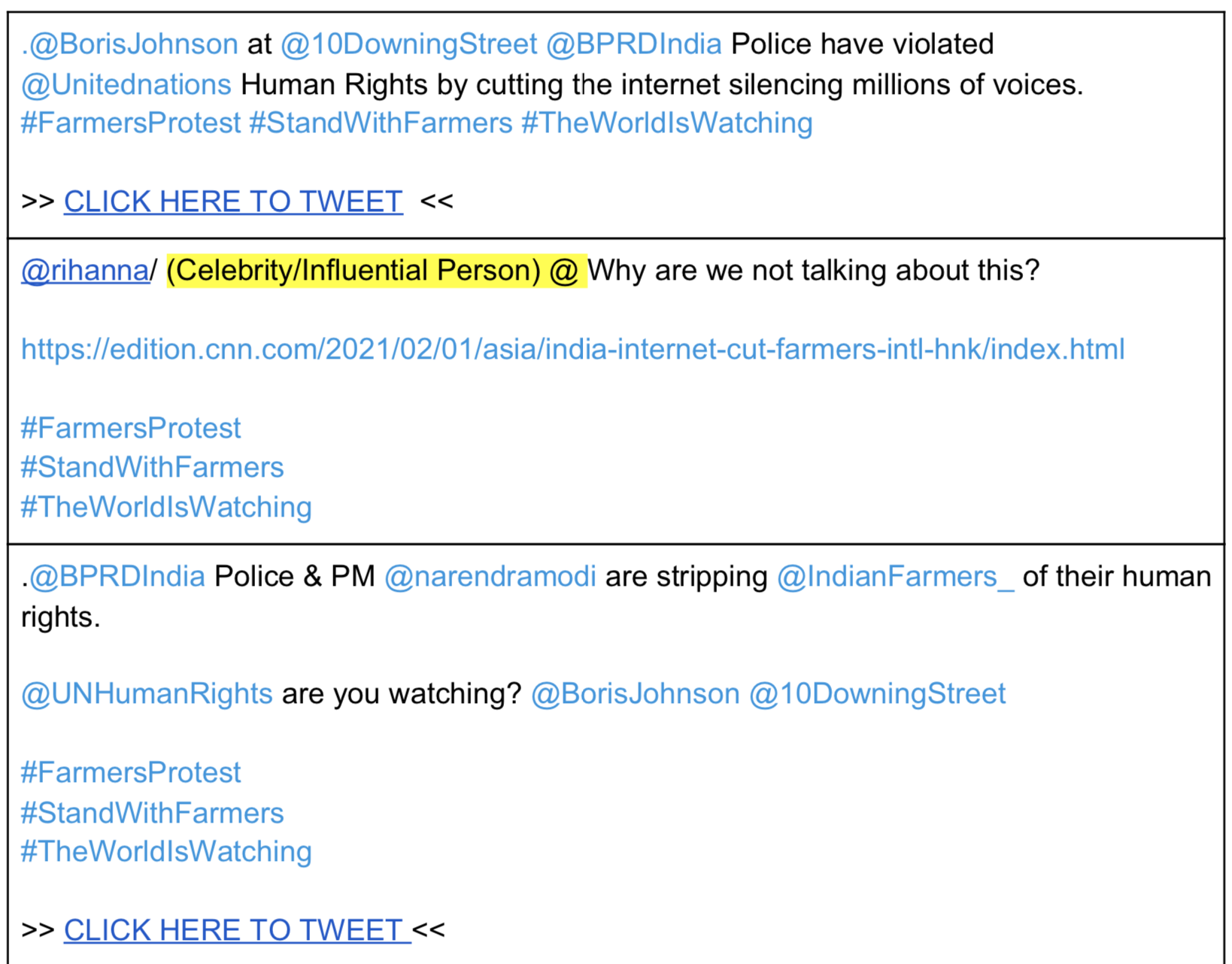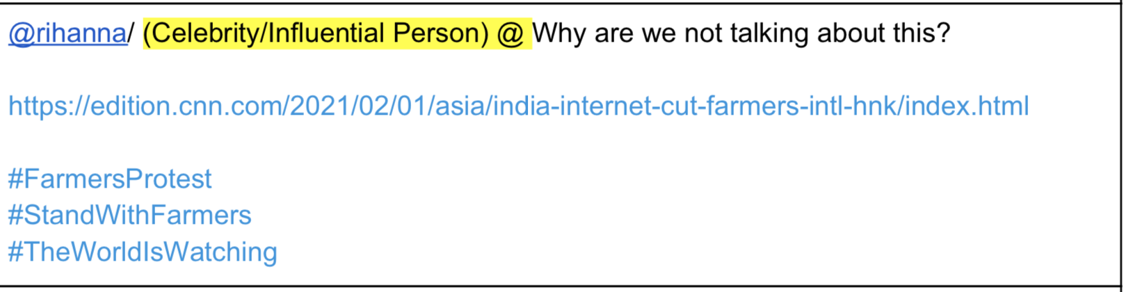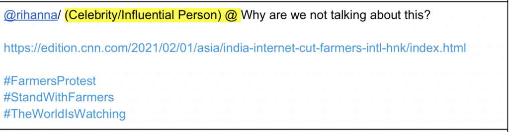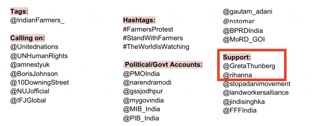 Rihanna tweeted her support to the violent protests on the 2nd of February and Greta Thunberg tweeted on the wee morning (around 1:30 AM) on 3rd February. Both of them were mentioned in this document and used the exact hashtag that the document wanted to publicise – #FarmersProtest.