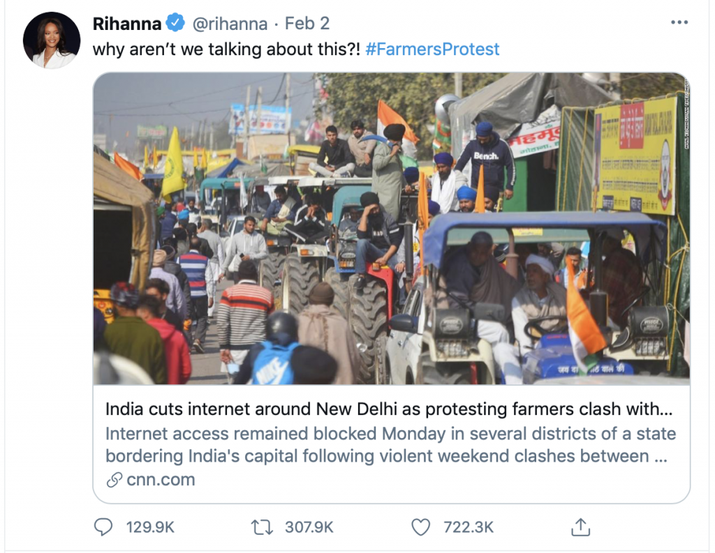 On the 2nd of February, environmental activist and baby-protestor Greta Thunberg and Rihanna tweeted in favour of the so-called farmers who have been protesting at the borders of Delhi for the past almost 3 months. It was these ‘protests’ that had taken a violent turn and the result, on the 26th of January, was a planned insurrection where these protestors and Khalistanis overtook the Red Fort, hoisted religious flags and indulged in widespread violence.