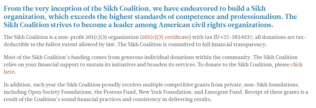 Its website states, “Most of the Sikh Coalition’s funding comes from generous individual donations within the community. The Sikh Coalition relies on your financial support to sustain its initiatives and broaden its services.”