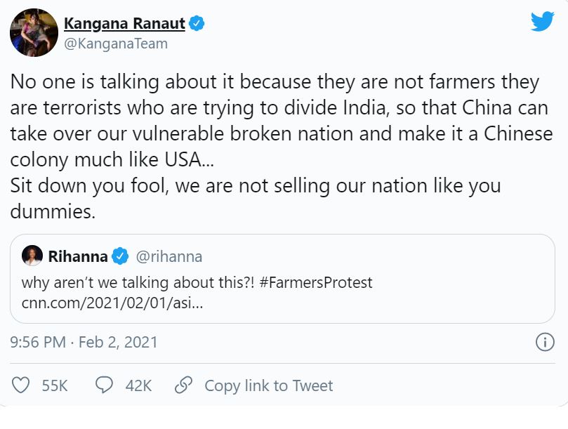 The action comes two days after Kangana Ranaut had expressed her vexation over Rihanna’s Tweet, which was a clear intervention into India’s domestic politics.