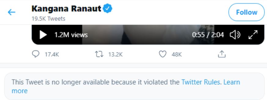 Hours after Jack Dorsey, the CEO of the micro-blogging site was caught validating tweets which hailed Hollywood singer-actress Rihanna for endorsing violence in the name of supporting ‘farmer’ protests, the micro-blogging site removed tweet by actor Kangana Ranaut where she spoke against the farmers’ protest which has laid siege to Delhi for over 71 days.