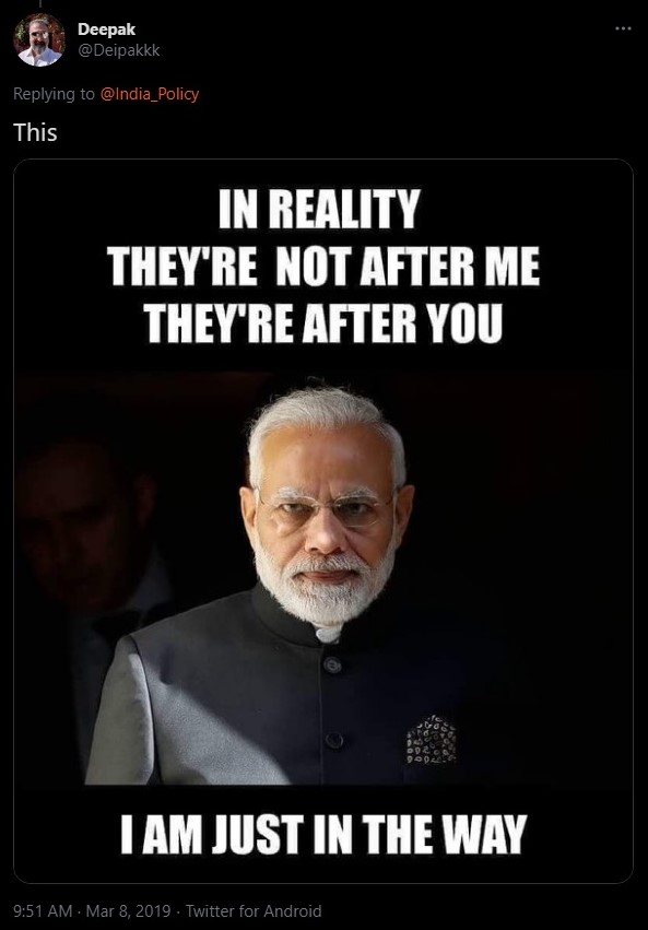 Under such circumstances, an old meme of Prime Minister Modi is circulating again where the text says, “They’re after you, I am just in the way.” The meme has been shared by the former Dutch ambassador to India as well as others such as Union Minister Smriti Irani.