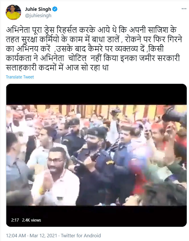 In a contentious tweet, Samajwadi Party spokesperson Juhie Singh labelled the journalists as ‘rehearsed actors’. “The actors had come prepared to stop the security personnel from doing their duty. After being stopped, they enacted falling and even gave statements. None of our party workers has injured any of the actors. Their conscience in lying in the feet of government’s advisors.”