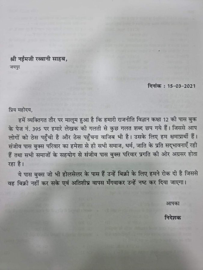 In a letter written to an Islamic cleric, the publication house said that some wrong words were printed on the 395 of the book due to mistakes of the author. Sanjiv Prakashan issued an apology for the same, and informed that they have stopped the sale of the book from the wholesalers, so that it can’t be sold in the market. They added that they will soon recall the book and destroy it.
