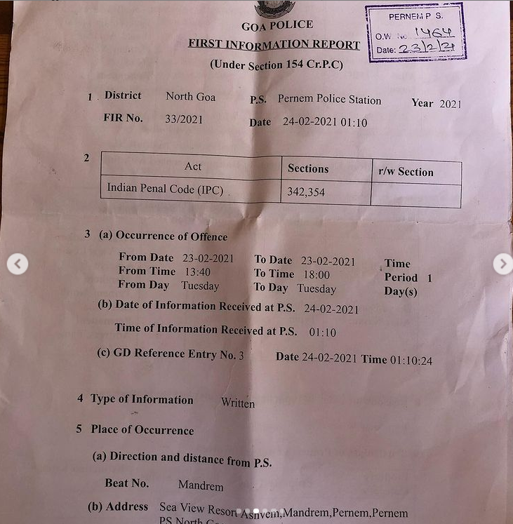 She wrote, “As the effects of the drugs finally were evaporating, I told her I wanted to leave, and she screamed ‘No baby, no baby. Let’s make love.’ Finally, she started yelling ‘the spirit allows me to let you go, you can leave.’ And I could leave the room, in shock.” Elodie drove to her friend’s house in Arambol who then took her to the Pernem police station, where a First Information Report (No.33/2021) was registered. Divya was booked under Indian Penal Code (IPC) Sections 342 (wrongful confinement) and 354 (sexual assault).