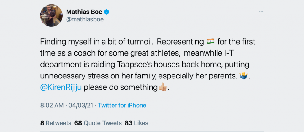 Nevertheless, many individuals have extended their support to Kashyap, Pannu and others, brushing aside the possibility that they might be guilty of evading taxes. One such individual is Mathias Boe, who is a coach of the Indian badminton doubles’ team. Boe, and who also apparently happens to be in a relationship with actor Taapsee Pannu, has taken to Twitter to urge Union Minister Kiren Rijiju to do ‘something’ about the IT raids going on against his girlfriend.