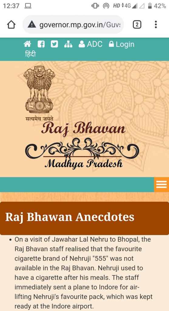 Anyway, there is a story about former PM Nehru that can make anyone roll eyes even today. On one of his visits to Bhopal, he was scheduled to stay at Raj Bhavan. However, the staff realized that his favourite brand of cigarettes was not available in Raj Bhavan. It was, in fact, not available in Bhopal, and Nehru was fond of lighting a stick after his meals.