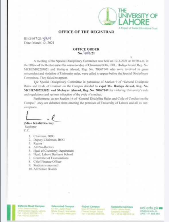 Moreover, they also invoked Section 16 and barred them from entering the university campus and its sub-campuses. The harsh punishment imposed by the varsity has sparked a debate online about the brazen moral policing in Pakistani campuses. However, several Islamists have come forward to justify the stringent action in the name of ‘Islamic morality.