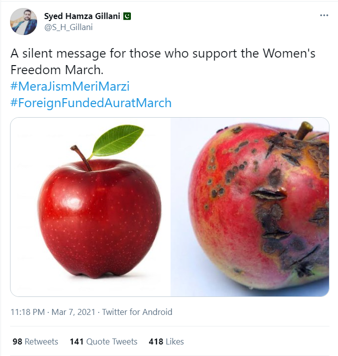 One Twitter user, Syed Hamza Gillani’s anti-women stance came to the fore when he compared the participants of the ‘Aurat March’ to rotten apples. “A silent message for those who support the Women’s Freedom March,” he wrote.