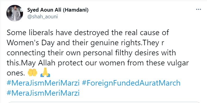 Twitter user Syed Aoun Ali wrote, “Some liberals have destroyed the real cause of Women’s Day and their genuine rights. They are connecting their own personal filthy desires with this. May Allah protect our women from these vulgar ones.”