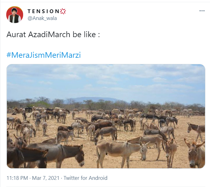 Another user did not bother to hide his misogyny. Comparing women to a herd of ‘donkeys’, he wrote “Aurat Azadi March be like:”