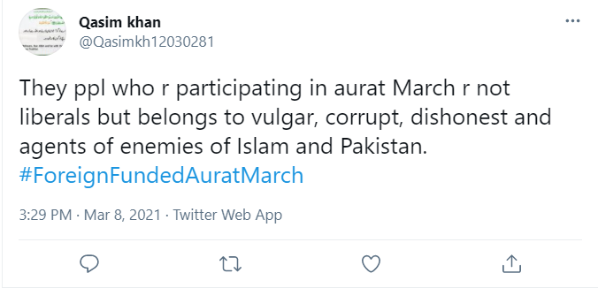 Reiterating the same narrative, one user tweeted, “They people who are participating in Aurat march are not liberals but belongs to vulgar, corrupt, dishonest and agents of enemies of Islam and Pakistan.”