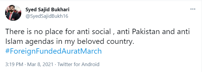 While labelling Aurat Azadi March as anti-social, anti-Pakistan and anti-Islam, one Syed Sajid Bukhari wrote, “There is no place for anti-social, anti-Pakistan and anti-Islam agendas in my beloved country.”