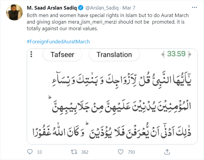 It must be pointed out that regressive Pakistanis had been deliberately misinterpreting the slogan ‘mera jism meri marzi‘ to suggest that the women participating in Aurat March want to have physical relations with several men. While the objective behind the slogan was to emphasise women’s choice and liberty, Islamists have been using the said slogan to cast aspersions on the feminist movement.