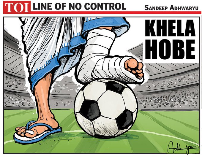 The wall painting is based on a cartoon by Sandeep Adhwaryu, which was published in the Times of India with the tagline ‘Khela Hobe’ (game is on). It shows Mamata Banerjee’s legs with her bandaged injured leg put on a football. It was after Mamata Banerjee was injured in Nandigram, where she had alleged that she was attacked, but later it was revealed that it was an accident. Following the accident, images of Mamata Banerjee with her leg in plaster and bandage had appeared. The cartoon depicted that despite the CM suffering the injury, the game was still on.