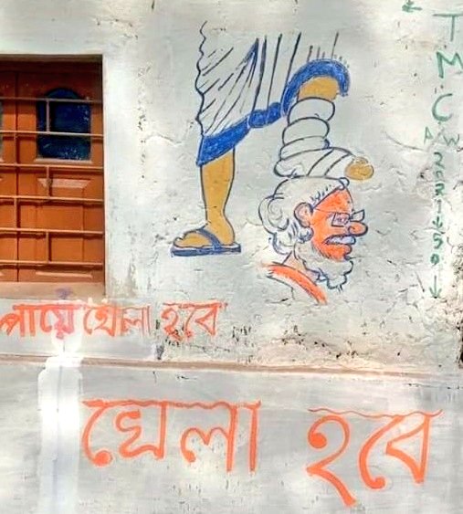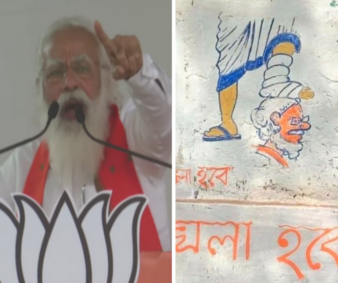 While addressing a rally in Bankura in West Bengal, Prime Minister Narendra Modi referred to the murals being drawn on walls in West Bengal where CM Mamata Banerjee is shown putting her leg on his head. This comes after TMC workers have been busy creating the images and circulating the same on Social Media. It shows West Bengal CM Mamata Banerjee putting her bandaged foot on Prime Minister Modi’s head.