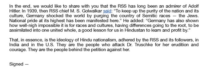 “In the end, we would like to share with you that the RSS has long been an admirer of Adolf Hitler…That, in essence, is the ideology of Hindu nationalism, adhered by the RSS and its followers, in India and in the U.S. They are the people who attack Dr Truschke for her erudition and courage. They are the people behind the petition against her,” the letter signed by CAIR, IMAC and other far-left organisations in support of Audrey Truschke read.