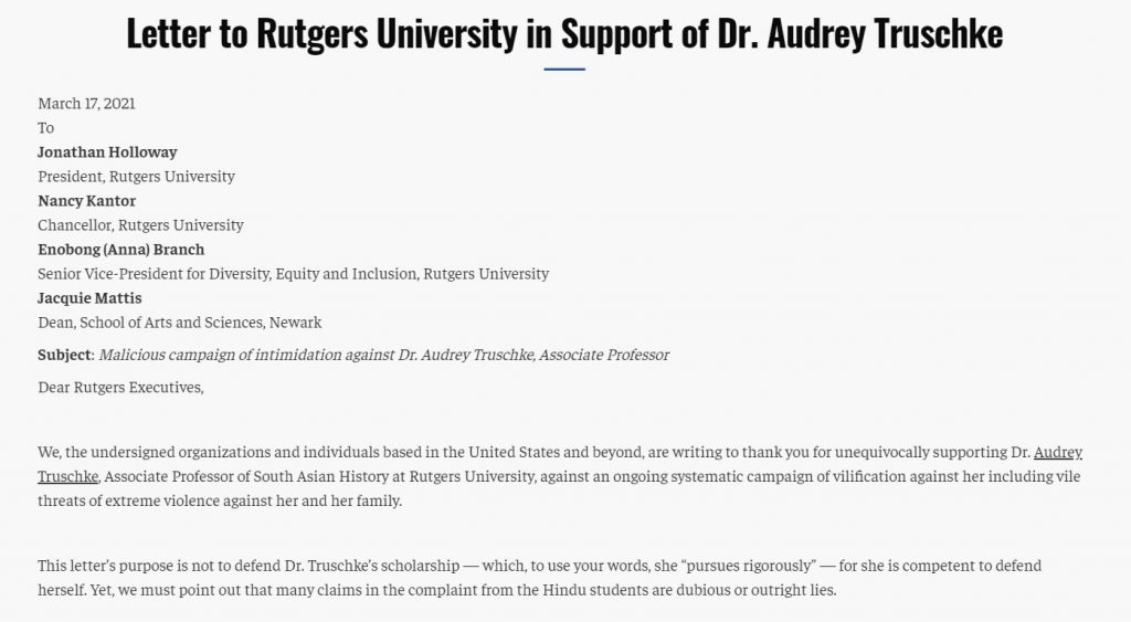 The letter by the faculty members had come as a response after Rutgers University had issued an apology to the Hindu community for failing to communicate properly causing misunderstanding during the Audrey Truschke controversy. Though the university had issued an apology to the Hindu students, they have remained silent in their latest statement about the conduct of Audrey Truschke.