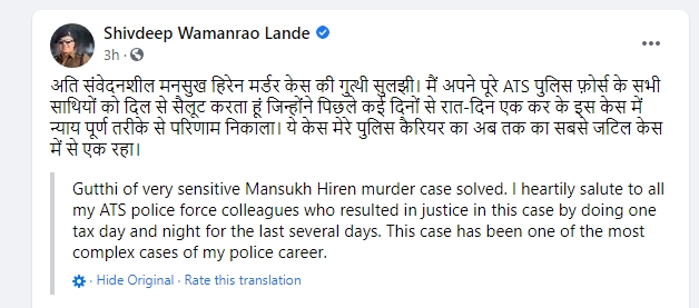 Shivdeep Wamanrao Lande, the Deputy Inspector General of Police (D.I.G.) for the ATS, posted a message on Facebook today, saying that the puzzle of the very sensitive Mansukh Hiren murder case has been solved.