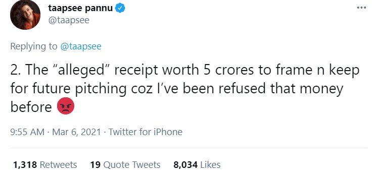 It is pertinent to note that the IT department, following the raids, had said, “Evidence of cash receipts by the leading actress amounting to Rs 5 crore has been recovered”. However, they had not named the ‘actress’. Taapsee Pannu, in a hurry to attack the IT department, perhaps revealed that it was her who had been questioned over unaccounted cash.