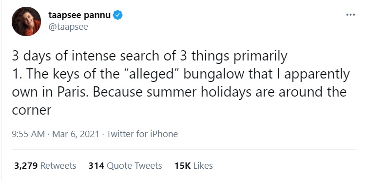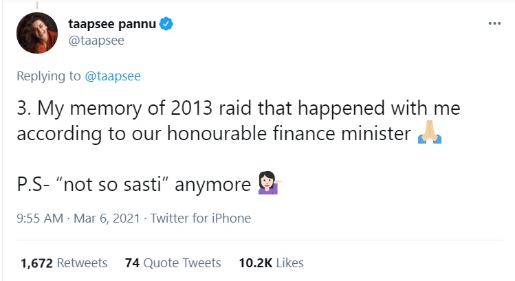 Taking a dig at the Finance Minister, Taapsee Pannu said, “My memory of 2013 raid that happened with me according to our honourable finance minister”.