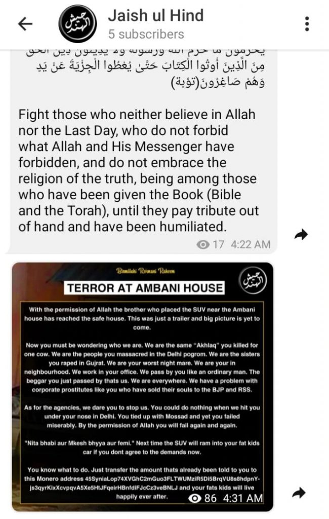 February 27: Two days after the SUV laden with explosive material was discovered outside Antilla, the residence of Mukesh Ambani and his family in Mumbai, a threatening message from a Telegram account in the name of Jaish ul Hind was posted, along with a demand for payment in a cryptocurrency (Monero) from Mukesh Ambani.