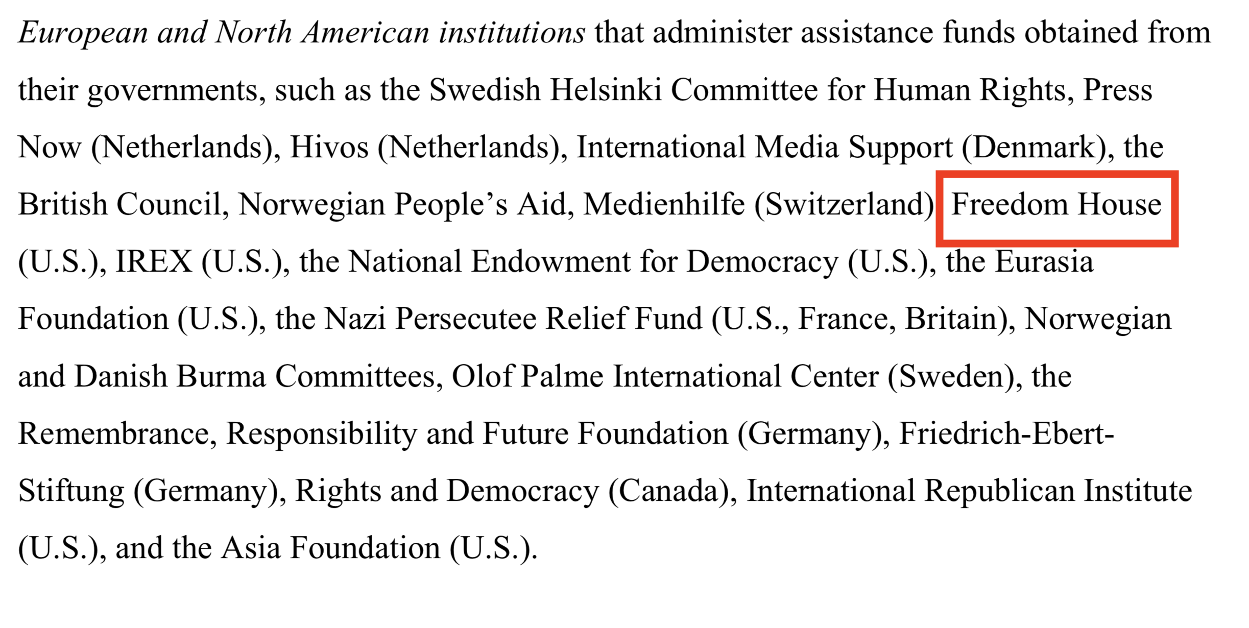 Freedom House – Funded almost wholly by the US government, acting as a policy arm of the US establishment