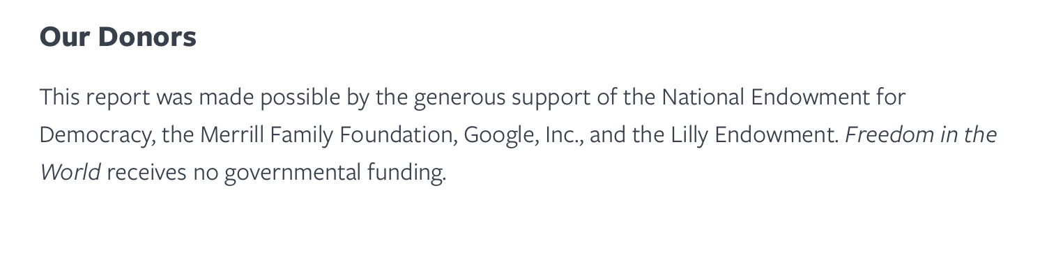 While claiming that the Freedom in the World report received no government funding, it discloses that the report is made possible by the ‘generous support’ of the National Endowment for Democracy, among other donors.