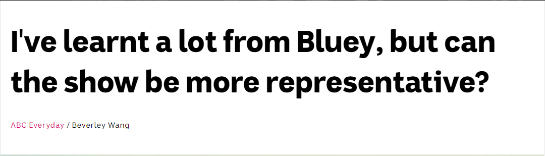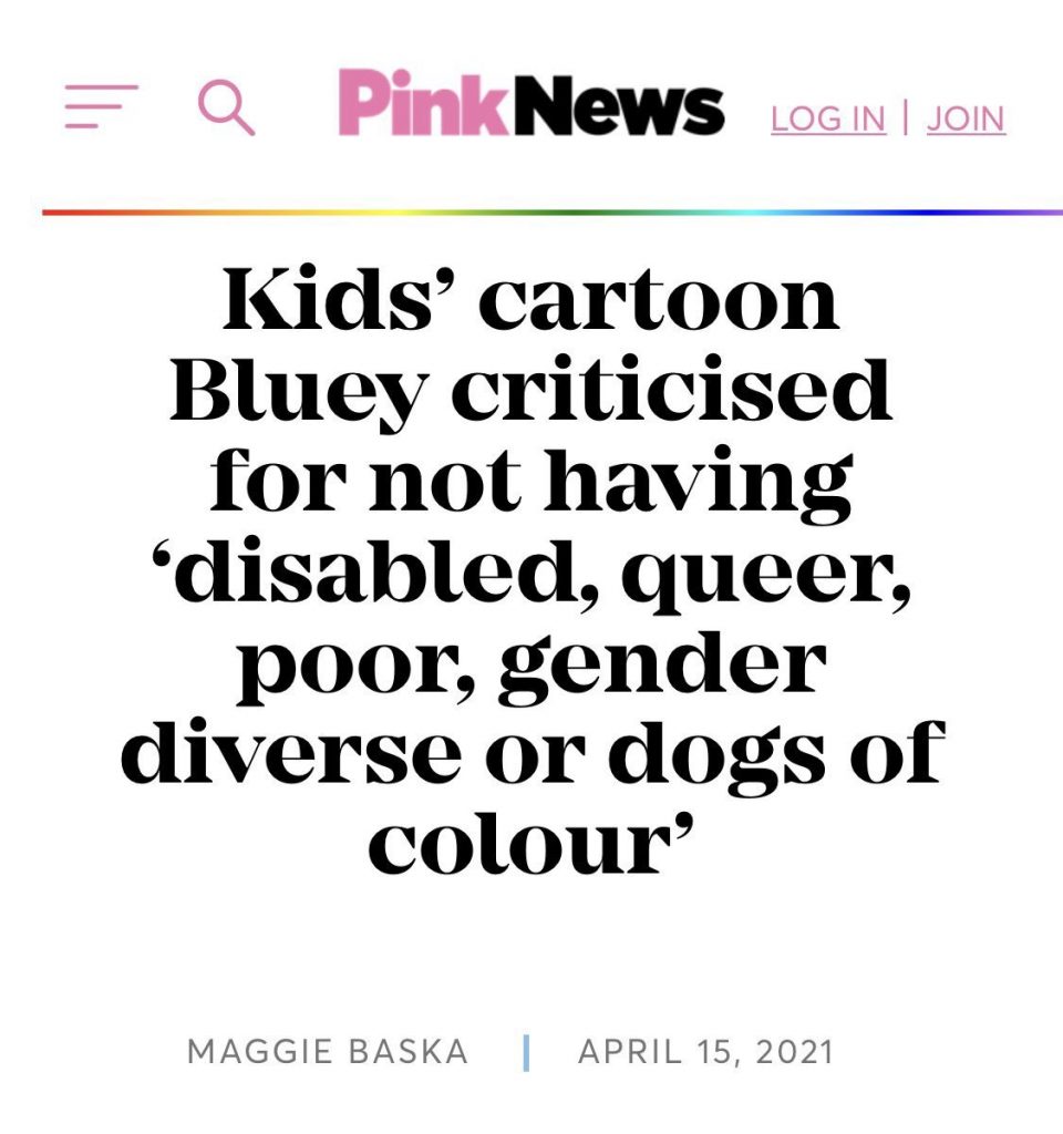 Beverly Wang, nevertheless, did receive support from popular LGBTQ+ digital media outlet PinkNews. PinkNews (PN) published a report in support of the ABC journalist with the headline, “Kids’ cartoon Bluey criticised for not having ‘disabled, queer, poor, gender diverse or dogs of colour’”. On social media, PN said that Wang had prompted an “important debate”.