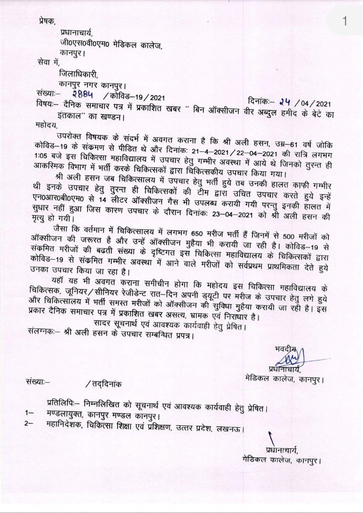 After such claims made by the media, the Principal of the GSVM Medical College, also known as Kanpur Medical College, wrote a letter to the DC of Kanpur city district denying the reports. He has denied that there is oxygen shortage in the hospital, and said that Hasan was provided as soon as he was admitted.